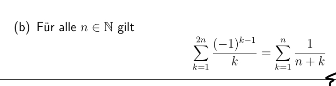 \(\bf{\text{Zeigen Sie mit vollständiger Induktion:}} \\ \displaystyle \sum\limits_{k=1}^{2n} \dfrac{ (-1)^{k-1} } { k } =\sum\limits_{k=1}^{n} \dfrac{ 1 } { n+k }, \text{ für alle } n \in \mathbb{N} \)