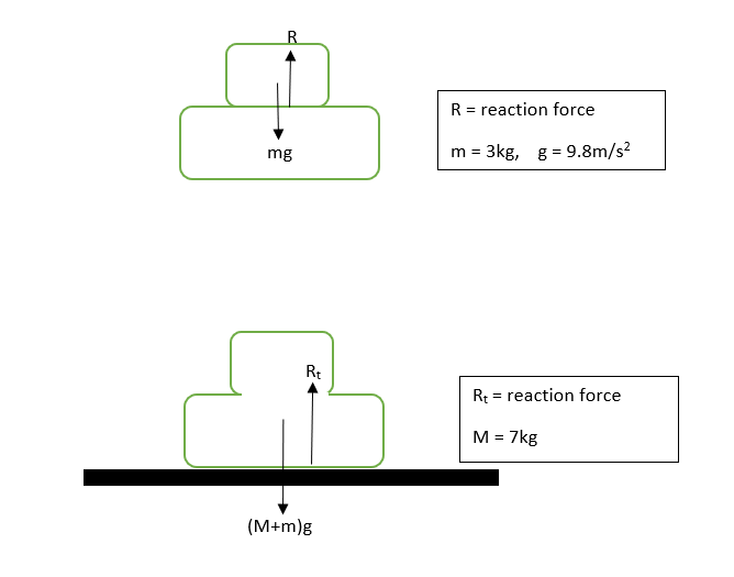 For question 3, note that the 700g mass is being pulled down by gravity as is the 500g mass. However, because they are on opposite sides of a pulley, there will be a net force of (0.7 - 0.5)*9.8 N pulling the 700g mass downwards and the 500g mass upwards. Find the time it takes the 700g mass to reach the floor using s = ut + (1/2)at2, where s is the distance (20cm). Find the velocity of both 700g and 500g (the same for both, of course) from v1 = u + at. This will act as the initial upward velocity for the 500g mass which will carry on rising against gravity, but slowing until it comes to a stop.