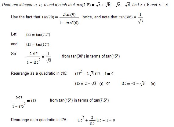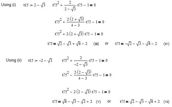 I should note that only the first result (ie a=2, b=6, c=3, d=4) matches tan(7.5°).