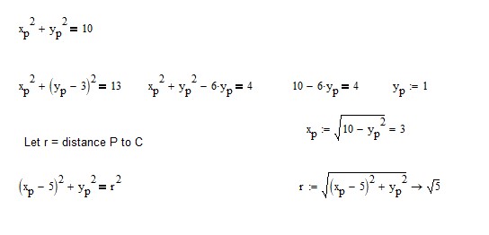 Triangle ABC has vertices A(0, 0), B(0, 3) and C(5, 0). A point P inside the triangle is sqrt(10) units from point A and sqrt(13) units from point B. How many units is P from point C? Express your answer in simplest radical form.