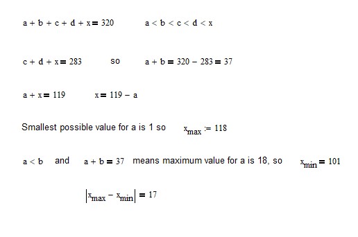 The sum of five different positive integers is 320. The sum of the greatest three integers in this set is 283. The sum of the greatest and least integers is 119. If x is the greatest integer in the set, what is the positive difference between the greatest possible value and least possible value for x?