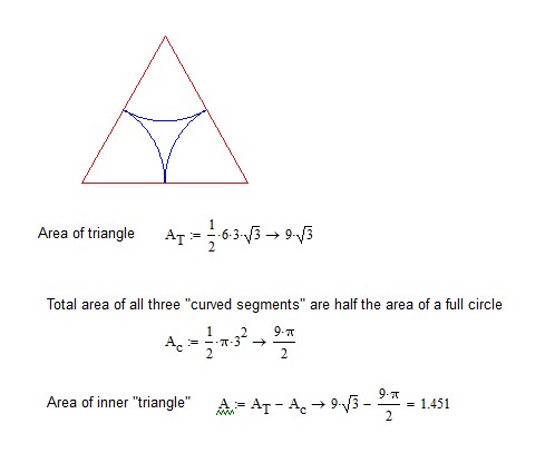 ABC is an equilateral triangle with side length 6. Arcs are drawn centered at the vertices, connecting the midpoints of consecutive sides as shown. Find the area of the “triangular” region in the middle.