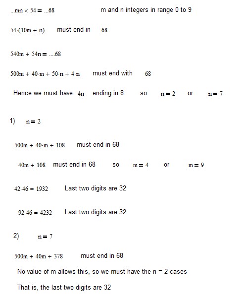 A 2015 digit number is multiplied by 54 to yield the last two digits as 68 in the same order. If the same number is multiplied by 46, the last two digits in order are?
