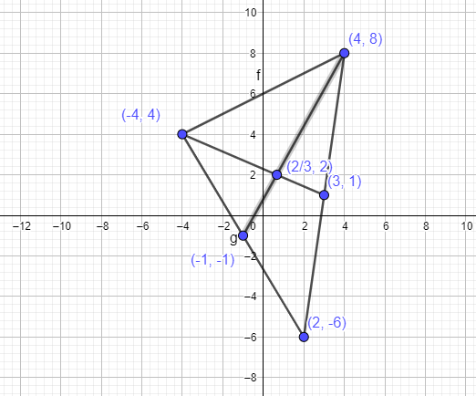 Consider one specific triangle ABC with A=(4,8), B=(2,-6), and C=(-4,4).
