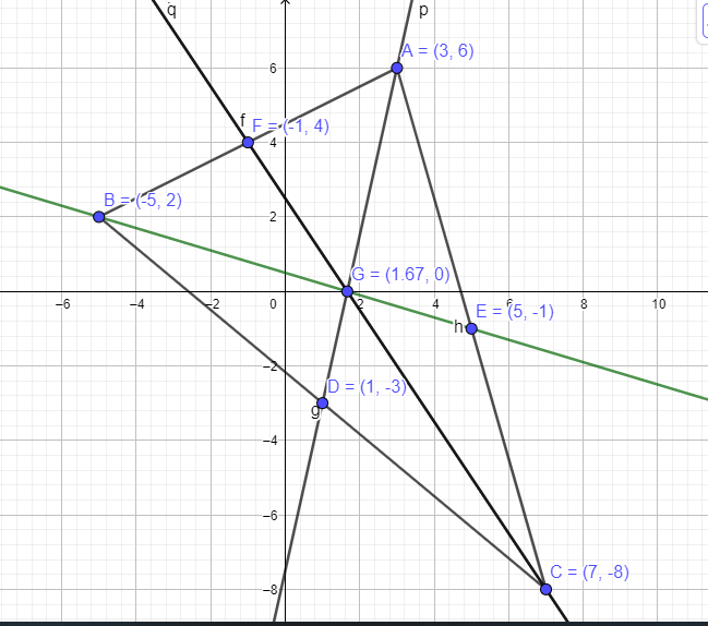 Midpoint of BC = [ (7 - 5) / 2 , (-8 + 2) / 2) = ( 2/2 , -6/2) = (1, -3) = D
