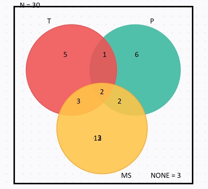 The numbers don't add up....here is a Venn Diagram (bottom nember is 13)