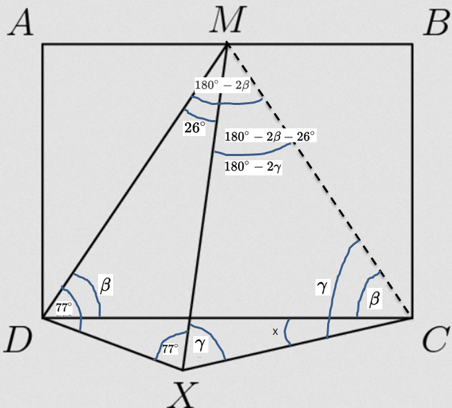 \(\mathbf{ \large{x =180^{\circ} - 2 \times \gamma} } \)