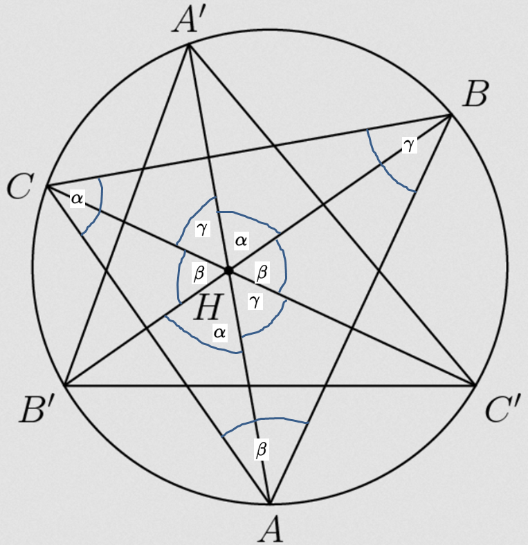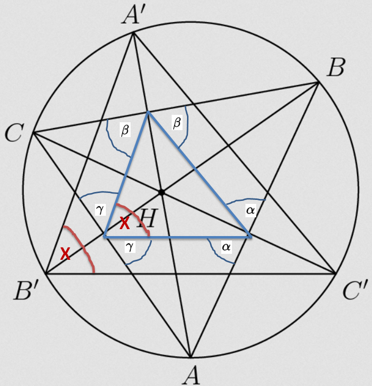 \(\text{Let $\angle A'B'C' = \angle CAB = x$ } \\ \text{Let $\angle ACB= \alpha $ } \\ \text{Let $\angle BAC= \beta $ } \\ \text{Let $\angle CBA= \gamma $ } \\ \text{Let $\angle AHB = \gamma + \beta $} \\ \text{Let $\angle BHC = \alpha + \gamma $} \\ \text{Let $\angle CHA = \beta + \alpha $} \\ \text{Let $ \mathbf{x = 180^{\circ}-2 \times\gamma }$} \)