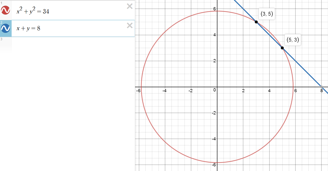 \(\begin{array}{|lrcl|lrcl|} \hline (1)& xy &=& 8 &(1) & xy &=& 8 \\ &\mathbf{y} &\mathbf{=}& \mathbf{\frac{8}{x}} & & \mathbf{y} &\mathbf{=}& \mathbf{\frac{8}{x}} \\\\ (2)& x+y &=& 6 &(2)& x+y &=& -6 \\ & x+\frac{8}{x} &=& 6 & & x+\frac{8}{x} &=& -6 \\ & x^2+8 &=& 6x & & x^2+8 &=& -6x \\ & x^2-6x+8 &=& 0 & & x^2+6x+8 &=& 0 \\ & x_{1,2}&=& \frac{6\pm \sqrt{36-4\cdot 8} }{2} & & x_{3,4}&=& \frac{-6\pm \sqrt{36-4\cdot 8} }{2} \\ & x_{1,2}&=& \frac{6\pm 4 }{2} & & x_{3,4}&=& \frac{-6\pm 4 }{2} \\ & x_{1,2}&=& 3\pm 1 & & x_{3,4}&=& -3\pm 1 \\\\ & \mathbf{x_1 =4} && \mathbf{x_2 = 2} & & \mathbf{x_3 = -2} && \mathbf{x_4 =-4} \\ & \mathbf{y_1} =\frac{8}{4}\mathbf{=2} && \mathbf{y_2} = \frac{8}{2}\mathbf{=4} & & \mathbf{y_3} = \frac{8}{-2}\mathbf{=-4} && \mathbf{y_4} = \frac{8}{-4}\mathbf{=-2} \\ \hline \end{array} \)