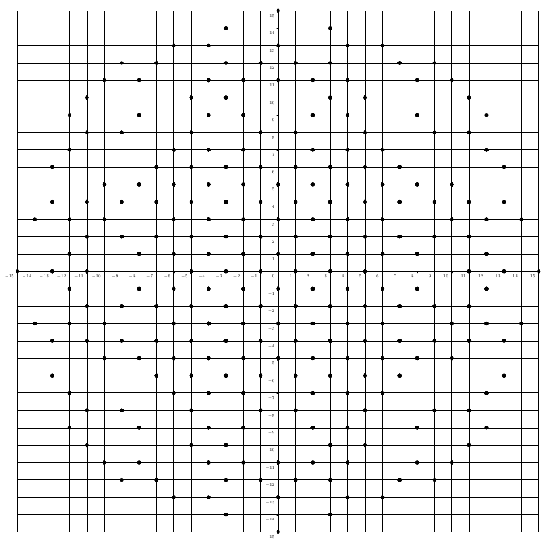 \foreach \x/\y in {5/0,4/3,3/4,0/5,-5/0,-4/3,-3/4,4/-3,3/-4,0/-5/,-4/-3/,-3/-4} %{\x \y,}