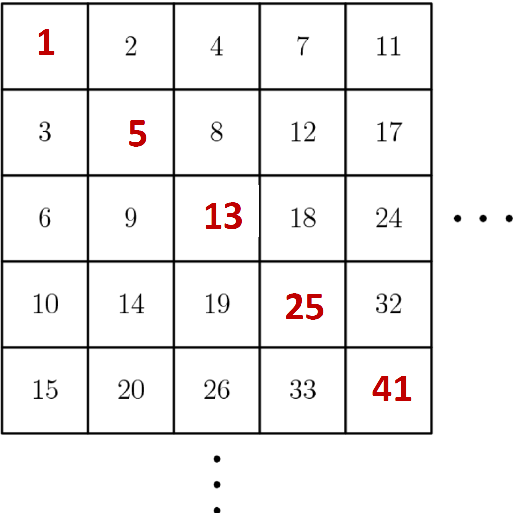 \(\text{The red entries in the main diagonal (n,n) form} \\ \text{an arithmetic series of the second order: {$1,5,13,25,41,\ldots$}}\)