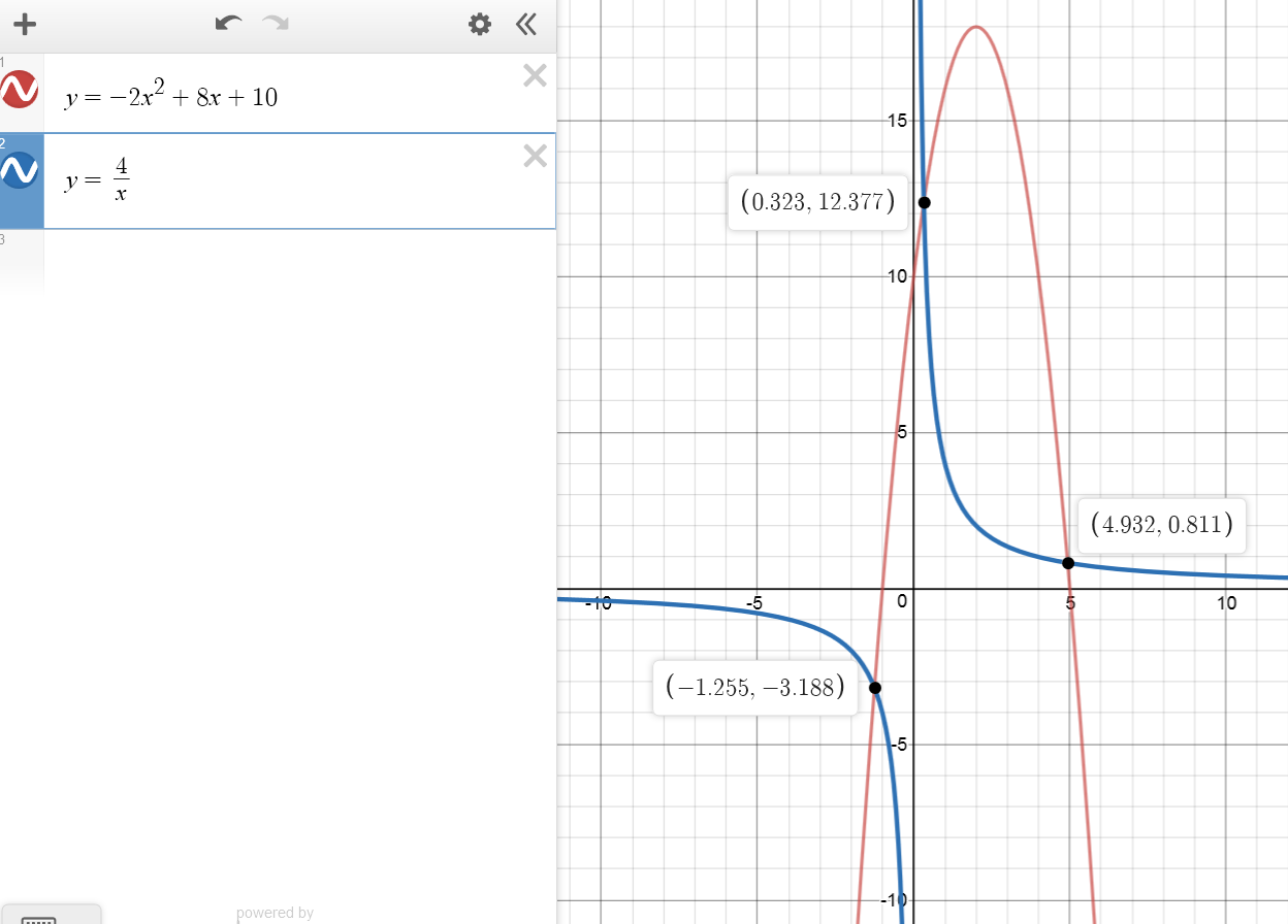 \(\begin{array}{|rcll|} \hline x^3-4x^2-5x+8 = ( x^2 - 3x-8 )(x-1) &=& 0 \\\\ x^2 - 3x -8 &=& 0 \\ x &=& \dfrac{3 \pm \sqrt{3^2-4(-8) } } {2} \\ x &=& \dfrac{3 \pm \sqrt{9+32} } {2} \\ x &=& \dfrac{3 \pm \sqrt{41} } {2} \\\\ x_2 &=& \dfrac{3 + \sqrt{41} } {2} \\ x_2 &=& 4.70156211872 \quad | \quad 1.\text{ quadrant } \\\\ x_3 &=& \dfrac{3 - \sqrt{41} } {2} \\ \mathbf{ x_3 } &\mathbf{=}& \mathbf{-1.70156211872} \quad | \quad 3.\text{ quadrant } \\\\ y_3 &=& \dfrac{16}{x_3} \\ y_3 &=& \dfrac{16}{-1.70156211872} \\ \mathbf{ y_3 } &\mathbf{=}& \mathbf{-9.40312423743} \\ \hline \end{array}\)