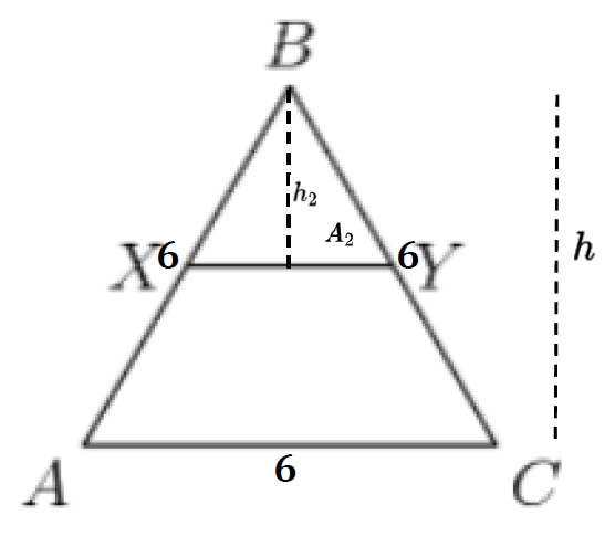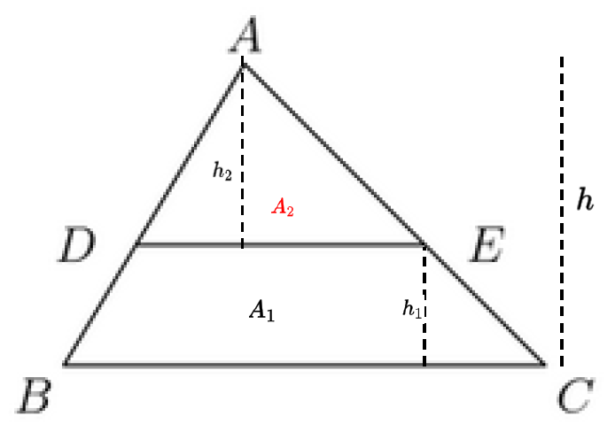 \(\text{Let trapezoid $ DBCE = A_1 $}\\ \text{Let triangle $ ADE = {\color{red}A_2} $} \\ \text{Let triangle $ ABC = A = A_1+A_2 = \dfrac{BC\cdot h}{2} $}\)