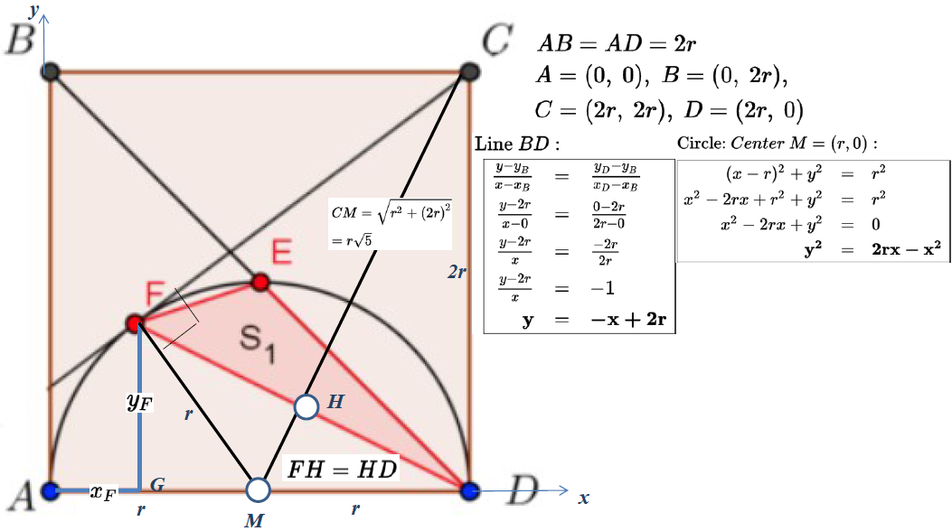 \(\begin{array}{|rcll|} \hline \mathbf{y_F}: \\ \hline y_F^2 &=& x_F(AD-x_F) \quad | \quad x_F=\dfrac{2r}{5},\ AD=2r \\\\ y_F^2 &=& \dfrac{2r}{5}(2r-\dfrac{2r}{5}) \\\\ y_F^2 &=& \dfrac{4r^2}{5} - \dfrac{4r^2}{25} \\\\ y_F^2 &=& \dfrac{20r^2}{5} - \dfrac{4r^2}{25} \\\\ y_F^2 &=& \dfrac{16r^2}{25} \\\\ \mathbf{y_F} &=& \mathbf{\dfrac{4r}{5}} \\ \hline \end{array}\)