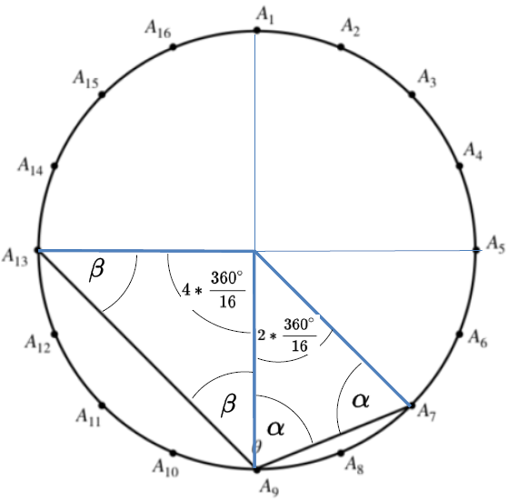 \(\begin{array}{|rcll|} \hline \mathbf{x_F}: \\ \hline FD^2 &=& (AD-x_F)*AD \quad | \quad FD=2FH,\ AD=2r \\ (2FH)^2 &=& (2r-x_F)*2r \quad | \quad FH =\dfrac{2r}{\sqrt{5}} \\ \left(\dfrac{4r}{\sqrt{5}}\right)^2 &=& (2r-x_F)*2r \\ \dfrac{16r^2}{5} &=& 4r^2-2rx_F \\ 2rx_F &=& 4r^2 - \dfrac{16r^2}{5} \quad | \quad :2r \\ x_F &=& 2r - \dfrac{8r}{5} \\ \mathbf{x_F} &=& \mathbf{\dfrac{2r}{5}} \\ \hline \end{array} \)