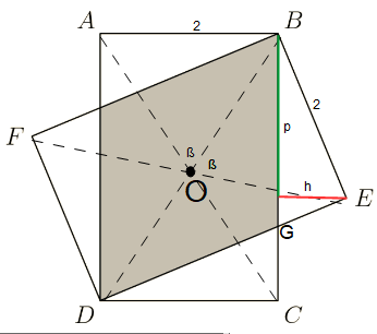 \(\begin{array}{|rcll|} \hline \mathbf{h}&=&\mathbf{x_E-x_B} \\\\ h&=&\dfrac{47}{17}-1 \\\\ \mathbf{h}&=&\mathbf{\dfrac{30}{17}} \\\\ \hline \mathbf{p} &=& \mathbf{y_B-y_E} \\\\ p &=& 4- \dfrac{52}{17} \\\\ \mathbf{p}&=&\mathbf{\dfrac{16}{17}} \\\\ \hline \mathbf{\overline{BE}^2} &=& \mathbf{p*\overline{BG}} \quad | \quad BE=2 \\ 2^2 &=& \dfrac{16}{17}*\overline{BG} \\ \overline{BG} &=& \dfrac{4}{\dfrac{16}{17}} \\\\ \mathbf{\overline{BG}} &=& \mathbf{\dfrac{17}{4}} \\\\ \hline \mathbf{\text{Gray area }} &=& \mathbf{2*8-\overline{BG}*h} \\ &=& \mathbf{2*8-\dfrac{17}{4}*\dfrac{30}{17}} \\\\ &=& 2*8-\dfrac{30}{4} \\\\ &=& 16-\dfrac{15}{2} \\\\ &=& \dfrac{32-15}{2} \\\\ &=& \dfrac{17}{2} \\\\ \mathbf{\text{Gray area }} &=& \mathbf{8.5} \\ \hline \end{array}\)