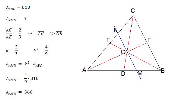 3: The medians AD, BE, and CF of triangle ABC intersect at the centroid G. The line through G that is parallel to BC intersects AB and AC at M and N, respectively. If the area of triangle ABC is 810, then find the area of triangle AMN.