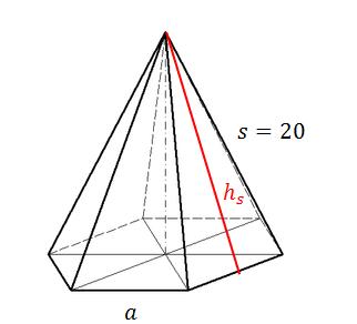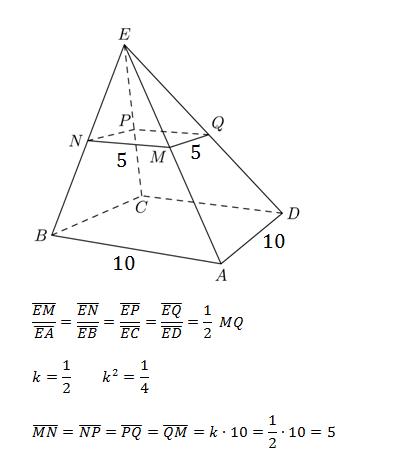 10)Let ABCDE be a pyramid, where the base ABCD is a square of side length 10. The total surface area of pyramid ABCDE (including all five faces) is 260.