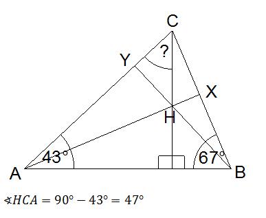Altitudes AX and BY of acute triangle ABC intersect at H. If angle BAC = 43 degrees and angle ABC = 67 degrees, then what is angle HCA?