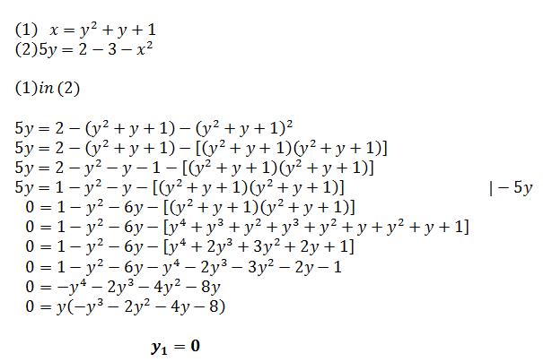Solve the system x = y^2 + y + 1, 5y = 2 - x - x^2.