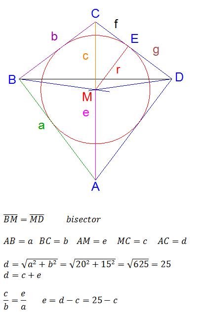 Quadrilaeral ABCD has right angles at B and D. If ABCD is a kite shaped with AB = AD = 20 and BC = CD = 15, find the length of the radius of the circle inscribed in ABCD.