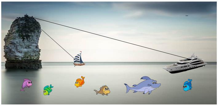 What is the distance (in feet) between the sailboat and the yacht? (Round to the nearest foot)