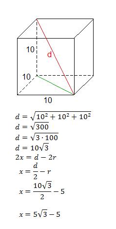 A sphere is inscribed in a cube with an edge of 10. What is the shortest possible distance from one of the vertices of the cube to the surface of the sphere?
