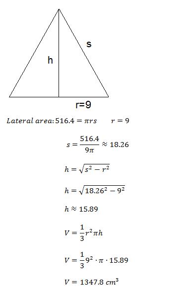 The base diameter of a right circular cone is 18 cm. If the lateral area is 516.4 cm2, find its volume in cubic centimeters