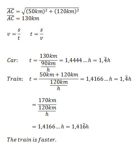 Town A is 50 km south of town B. Town C is 120 km east of town B. Is it quicker to travel directly from A to C by car at 90 km h¡1 or from A to C via B in a train travelling at 120 km h¡1?