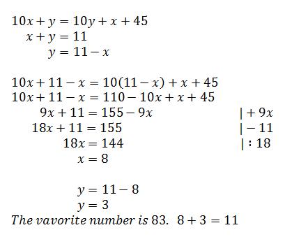 Sophie's favorite number is a two-digit number. If she reverses the digits, the result is 45 less than her favorite number. The sum of the digits in her favorite number is 11. What is Sophie's favorite number?
