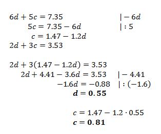 On Monday, Harold picked up six donuts and five large coffees for the office staff. He paid $7.35. On Tuesday, Melinda picked up two donuts and three large coffees for the office staff. She paid $3.53. What is the cost of one donut? What is the cost of one large coffee?