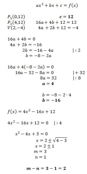 The parabola with equation y=ax^2+bx+c is graphed with a point of (4,12) and a vertex of (2, -4). The zeros of the quadratic ax^2 + bx + c are at x=m and x=n, where m>n. What is m-n?