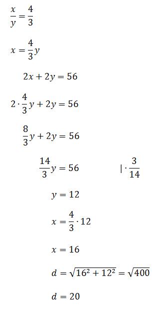 The perimeter of a rectangle is 56 meters. The ratio of its length to its width is 4:3. What is the length in meters of a diagonal of the rectangle?