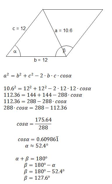 Holly selects a tile for her bathroom that is in the shape of a rhombus. Each side of the rhombus measures 12 inches. The diagonal opposite the smaller angle is 10.6 inches. What is the measure of the larger angle in the rhombus?