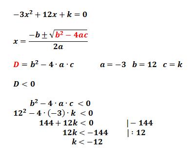 Determine the value of k for which -3x^2+12x+k=0 has no real roots.