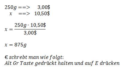 250g kosten 3$ wieviel gramm kann ich mir mit 10,50$ kaufen